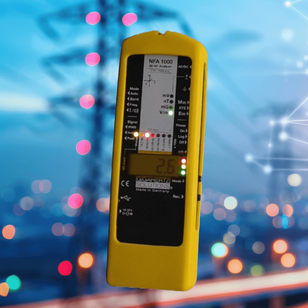 Le NFA1000 de Gigahertz Solutions est un analyseur professionnel de champs électromagnétiques basses fréquences (5 Hz à 1 MHz), conçu pour les mesures 3D précises des champs électriques (0,1 à 1999 V/m) et magnétiques (1 à 19 999 nT). Équipé d’une sonde 3D, d’un enregistreur de données et du logiciel NFASoft, il permet des analyses détaillées et automatisées, idéales pour les bio électriciens, les biologistes et les diagnostiqueurs de champs électromagnétiques du bâtiment. Il offre des mesures conformes aux normes de la Baubiologie, avec des fonctionnalités comme l’enregistrement longue durée et la compatibilité avec des sondes RF.